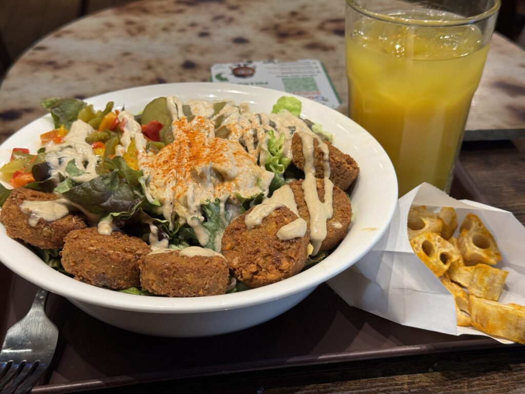 フムス(練りごまとひよこ豆のペースト)とファラフェル(豆の練り物のコロッケ)とロータスフライ(れんこん)、ジュースはマンゴージュースで