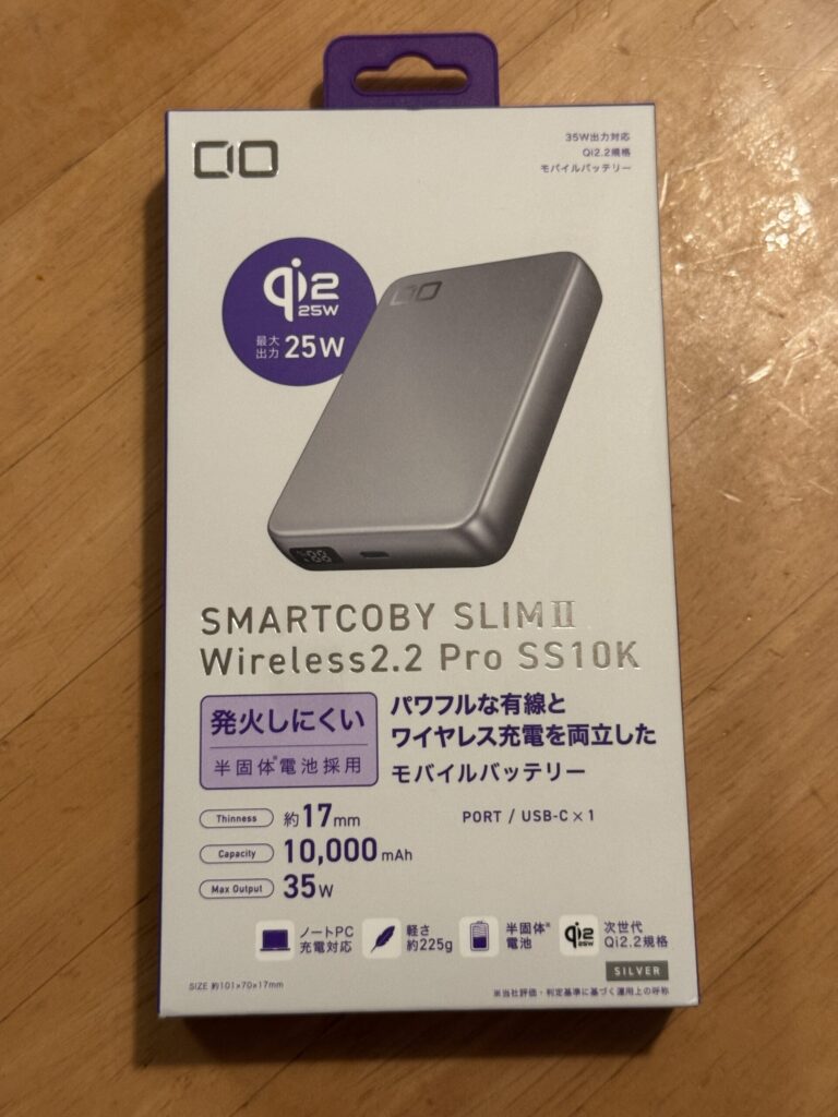 ワイヤレスで半個体(なんか燃えにくいらしい)でQi2.2(なんか凄い)で10000mAhのなかなかのバッテリー、ヨドバシのポイントで発売日に購入。